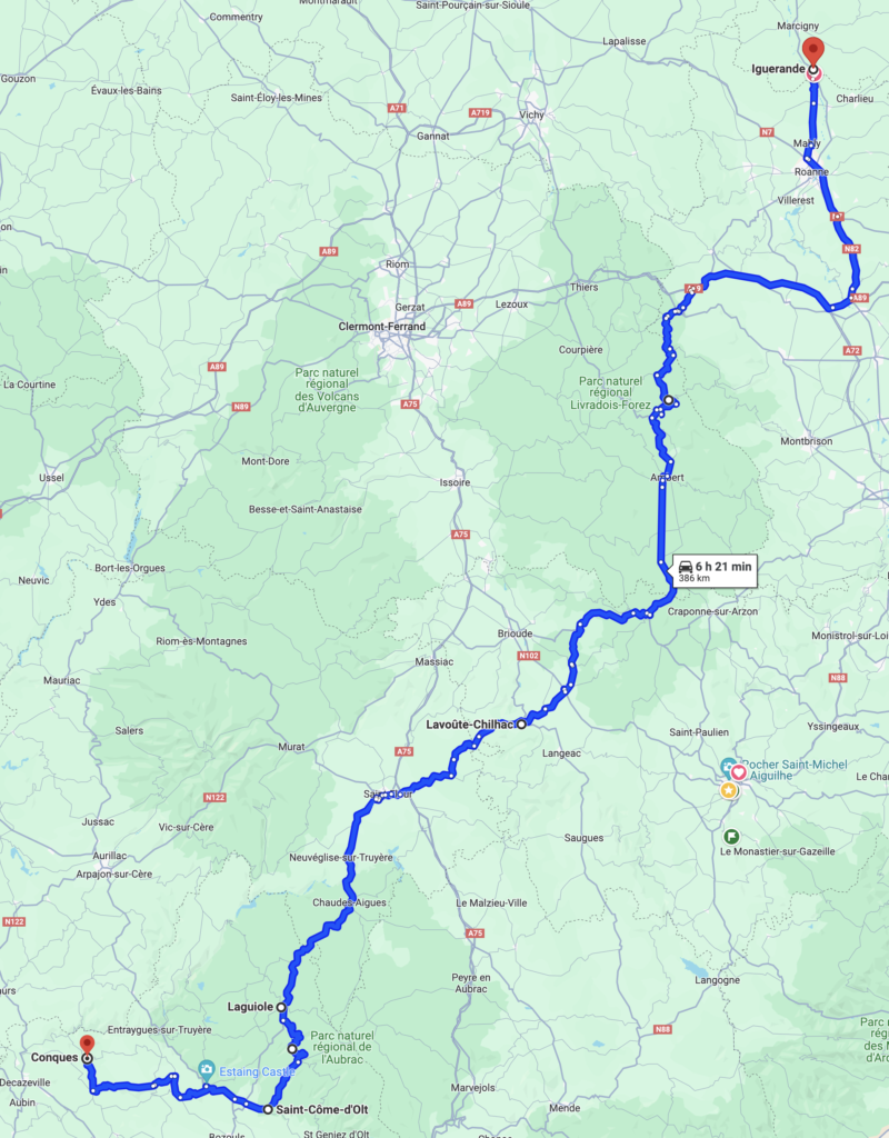 Heute geht’s weiter durch’s Massif Central: viel Natur und da und dort ein Dörfchen! Wir planen möglichst viel ohne Autobahn zu fahren – aber zeitlich kann es knapp werden. We will see!
