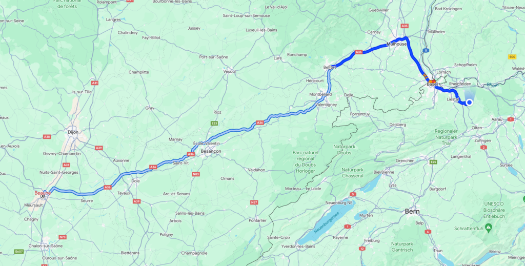 ROUTE 240915 403km6h154 Stopps Heute fahren wir von Basel in die Gegend von Iguarande. Die Route führt teilweise über Land, teilweise über die Autobahn: